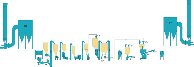 1.振動(dòng)落砂機(jī) 2.振動(dòng)輸送槽 3.懸掛磁選機(jī) 4.板鏈斗提機(jī) 5.破碎再生機(jī) 6.帶式斗提機(jī) 7.焙燒爐 8.沸騰冷卻床 9.氣力再生機(jī) 10.風(fēng)選機(jī) 11.砂溫調(diào)節(jié)器 12.氣力輸送罐 13.單機(jī)除塵器 14.固定式雙臂混砂機(jī) 15.移動(dòng)式雙臂混砂機(jī) 16.除塵器(用于落砂系統(tǒng)) 17.除塵器(用于再生系統(tǒng))